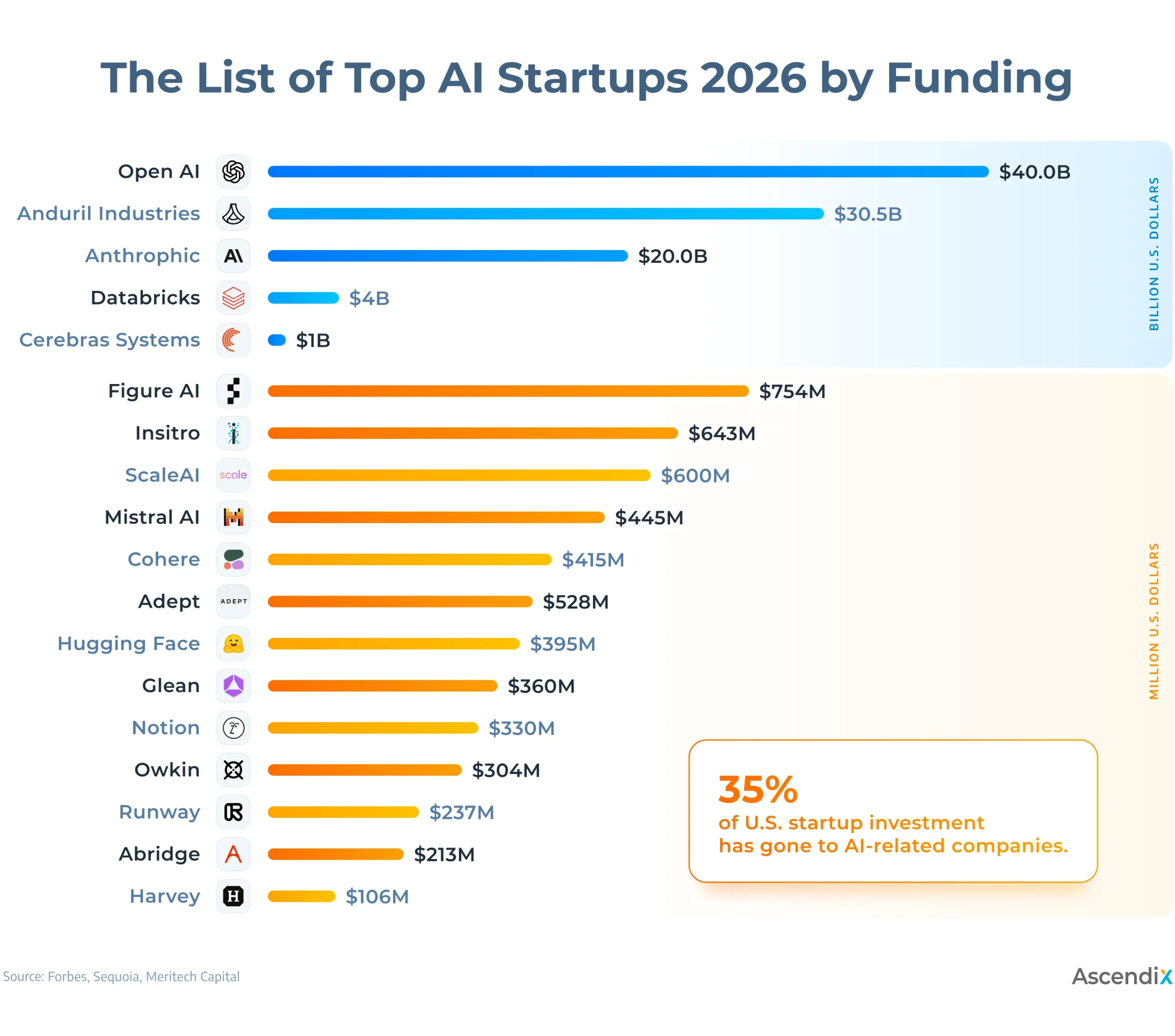 So far this year, 35% of U.S. startup investment has gone to AI-related companies, per Crunchbase data. At the very top of the list of AI startups in 2024 is OpenAI, which has cemented its status as the largest AI research organization in the world and has landed 11.3 billion USD in 2024. Anthropic and Hugging Face rank further among ML startups due to successfully creating decent rivals for ChatGPT. Meanwhile, LLM startups such as Cohere and Character.ai are advancing conversational AI, making these technologies more accessible to businesses and developers.